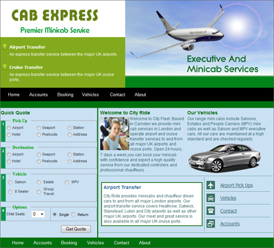 | Main Page | | Vehicles | | Accounts | | About Us | | Contact | | Airport Transfer Page | | Ports Transfer Page | | Control Panel | | Online Quotations | | Online Booking | | Online Payment | | | Price: £295 | | | | Monthly Hosting: £7.50 | | You can optionally add maintenance and upgrade to the above for an additional fee of £10 per month. | | Initial payment: £90 (inc VAT)